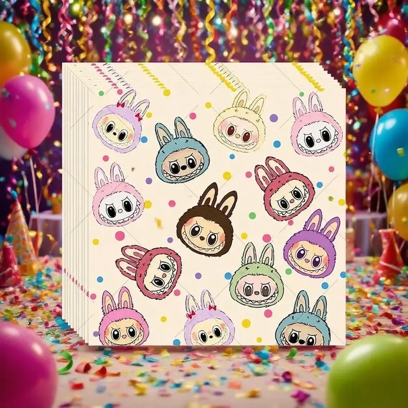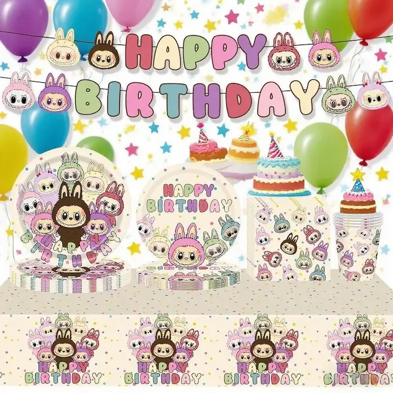 Labubu gimtadienio stalo reikmenų rinkinys – puikus pasirinkimas teminei vaikų šventei. Rinkinį sudaro popierinės lėkštės, puodeliai, servetėlės, staltiesė ir gimtadienio girlianda – viskas, ko reikia smagiai ir spalvingai šventės atmosferai sukurti. Rinkinyje 6 produktai: