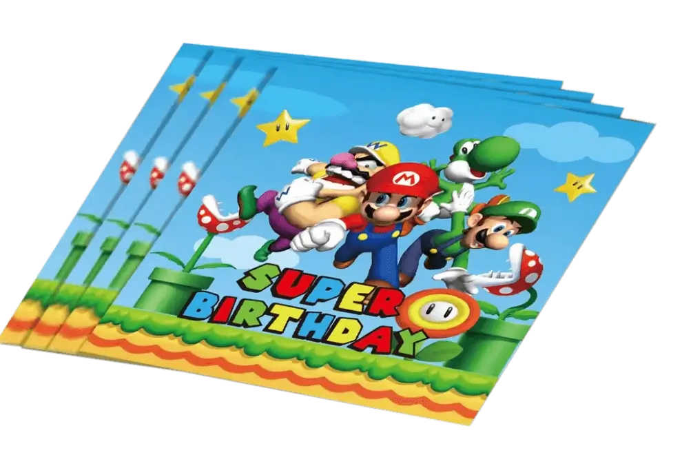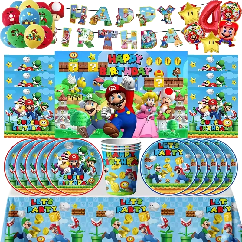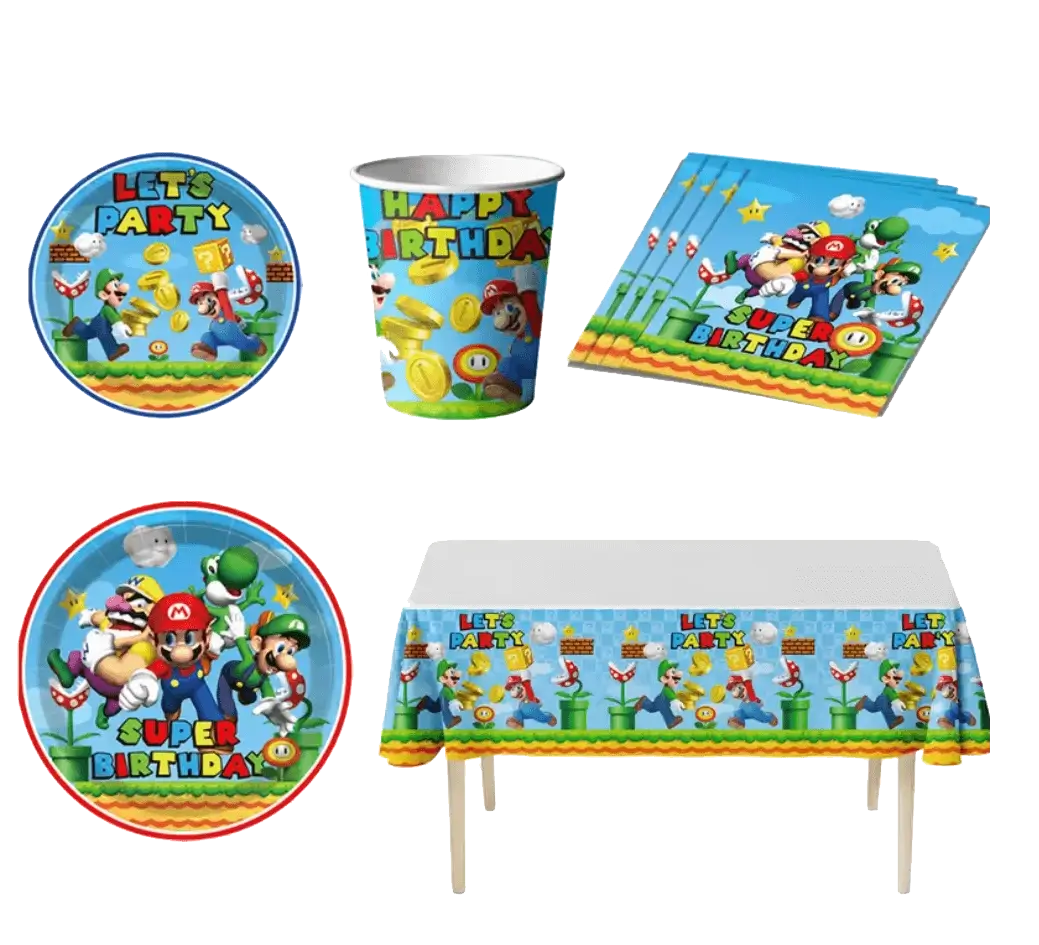 Rinkinį sudaro popierinės lėkštės, puodeliai, servetėlės, staltiesė, balionai, įrankiai ir gimtadienio girlianda – viskas, ko reikia žaismingai Mario pasaulio atmosferai sukurti. Lengvai naudojamas, aukštos kokybės rinkinys, tinkantis bet kokiai šventei. Rinkinyje 10 produktų: